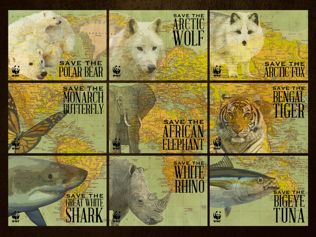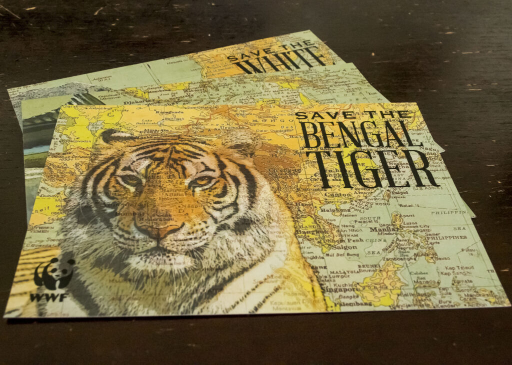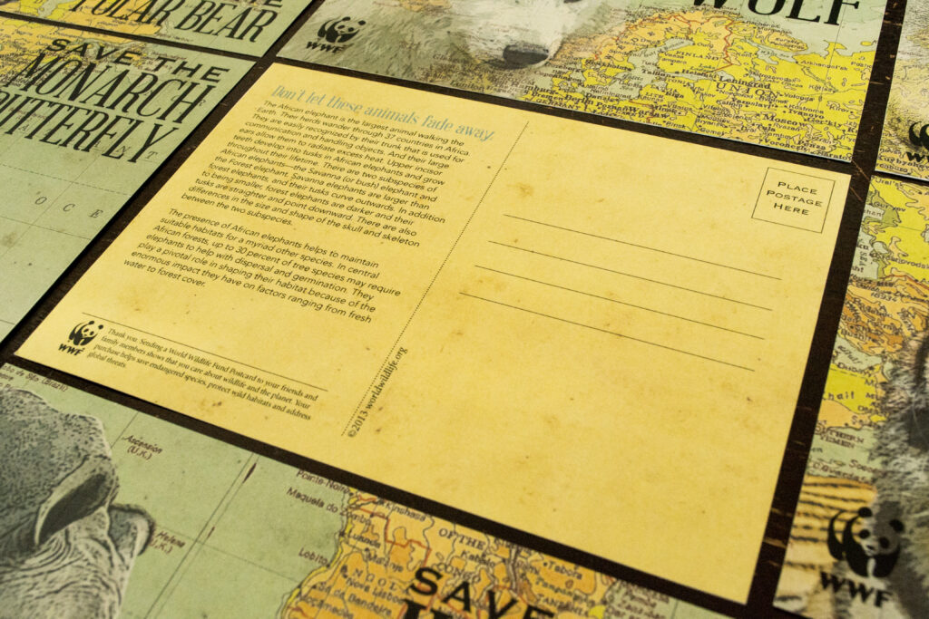 These nine postcards were created as a collector’s edition with the World Wildlife Fund’s Endangered Species List in mind. Each card features an endangered species and the location of its habitat. When all of the cards are arranged together, they form a complete world map.